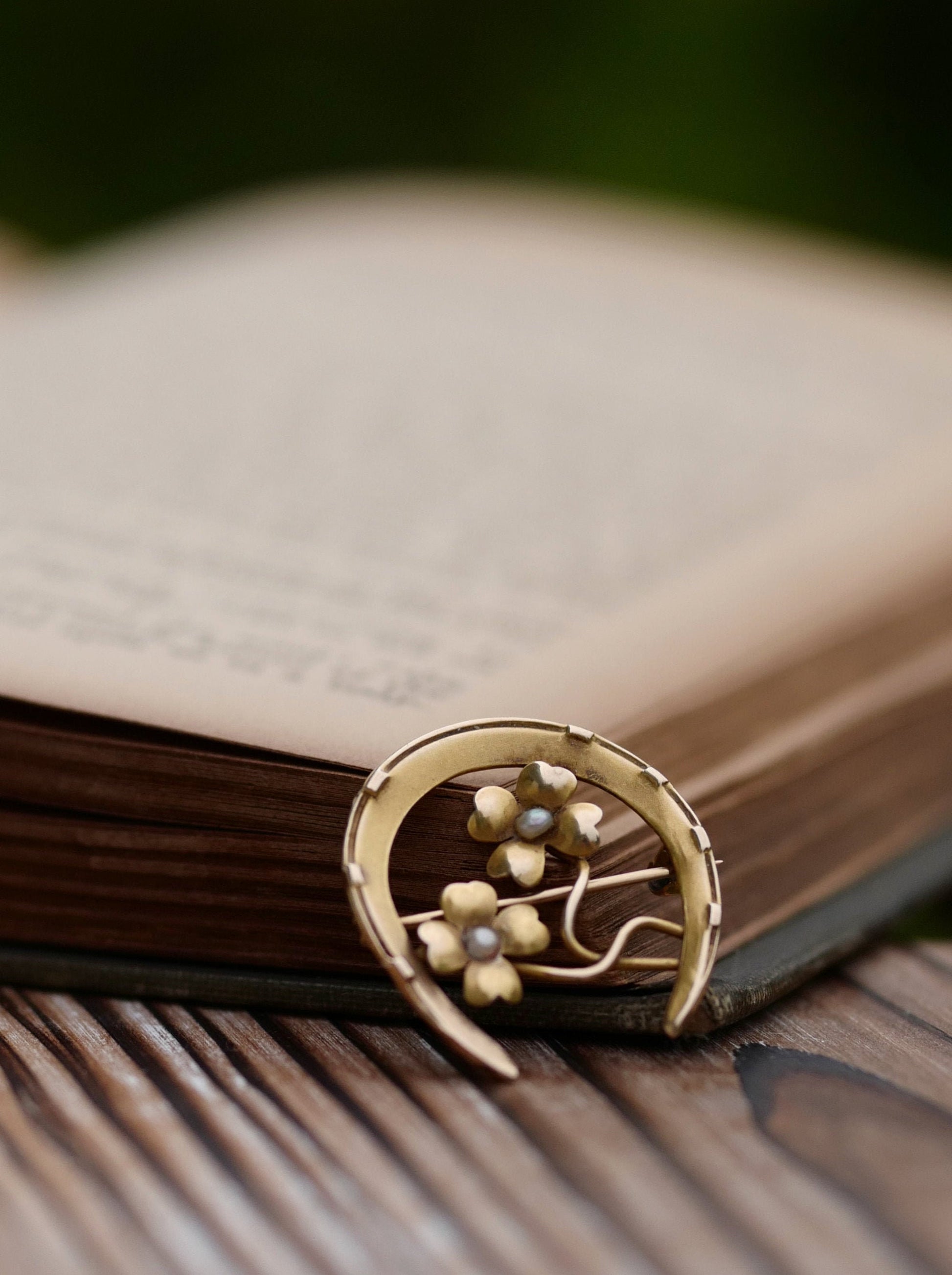 10K Vintage Horseshoe Pin with Flowers and Seed Pearls