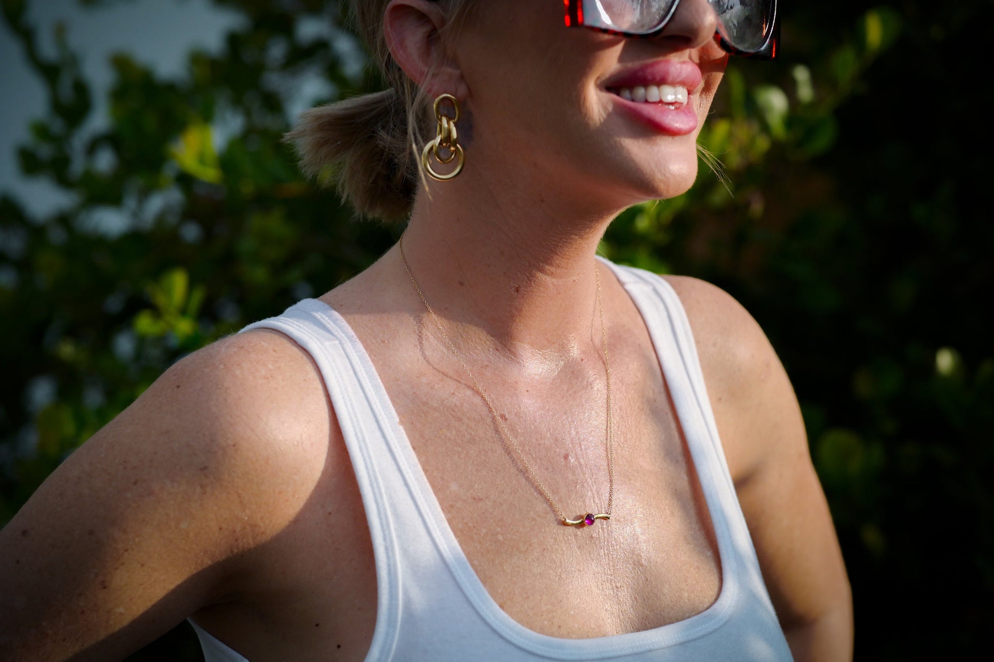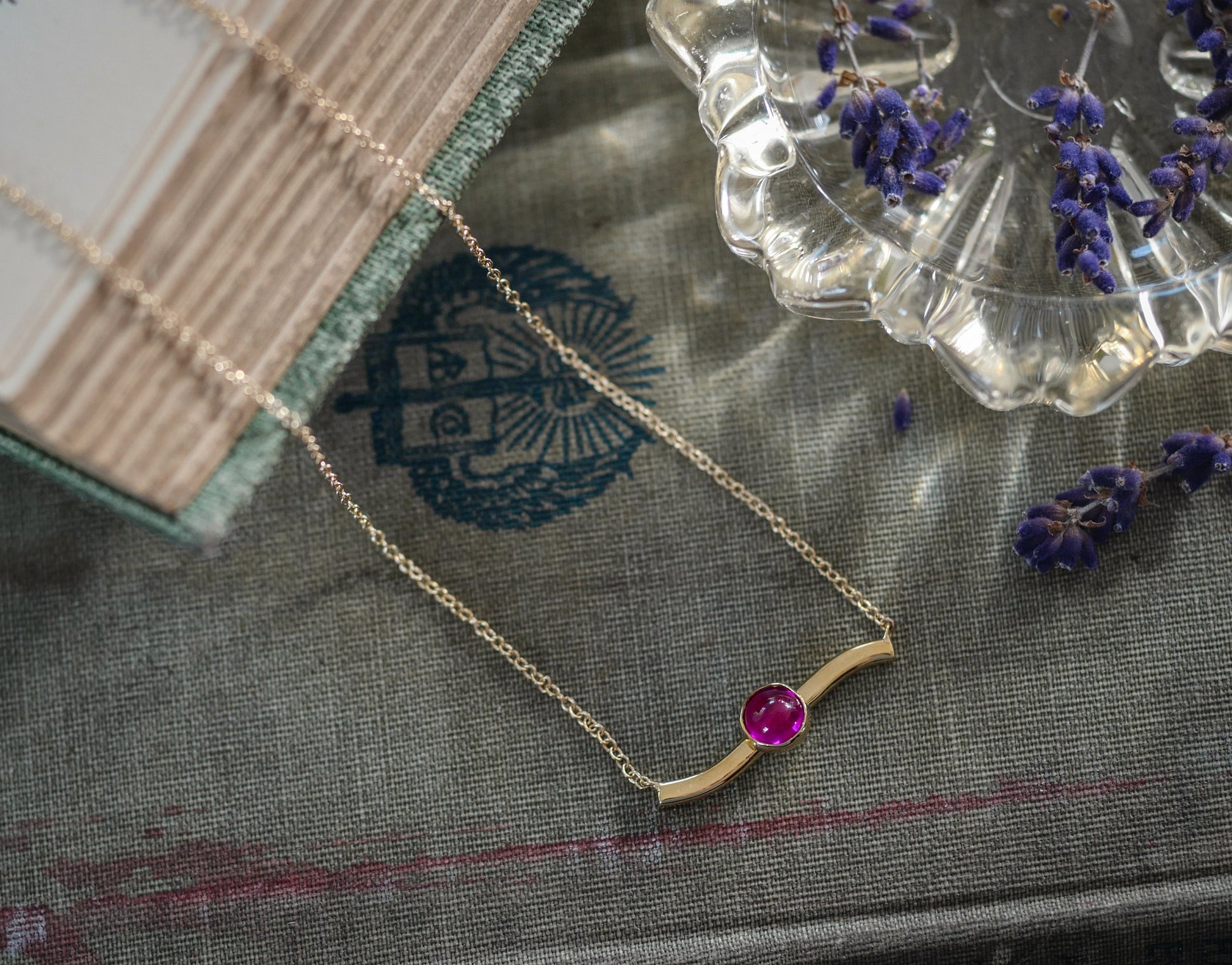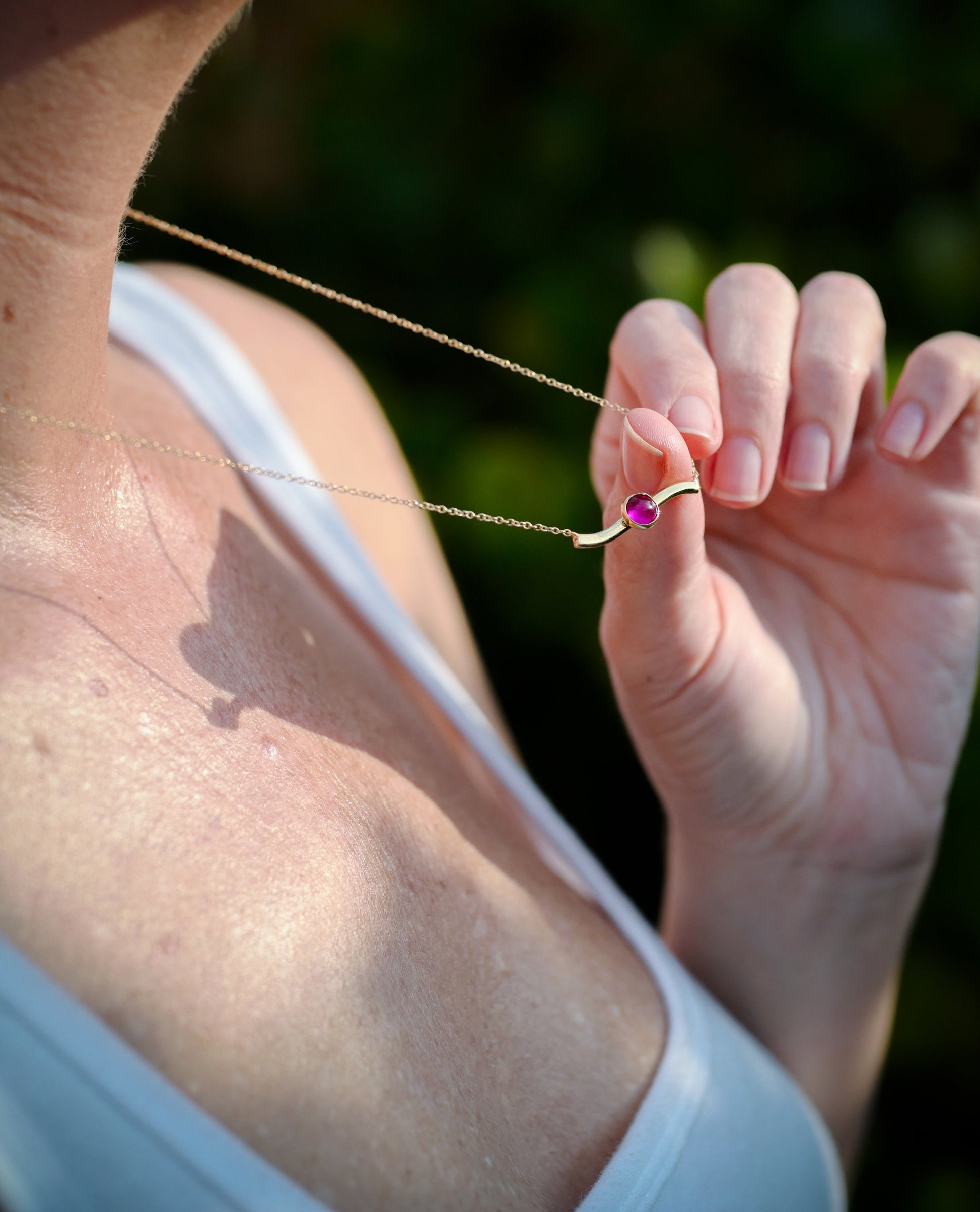 20" 14K Delicate Chain with 18K Solid Bar and Cabochon Ruby Necklace