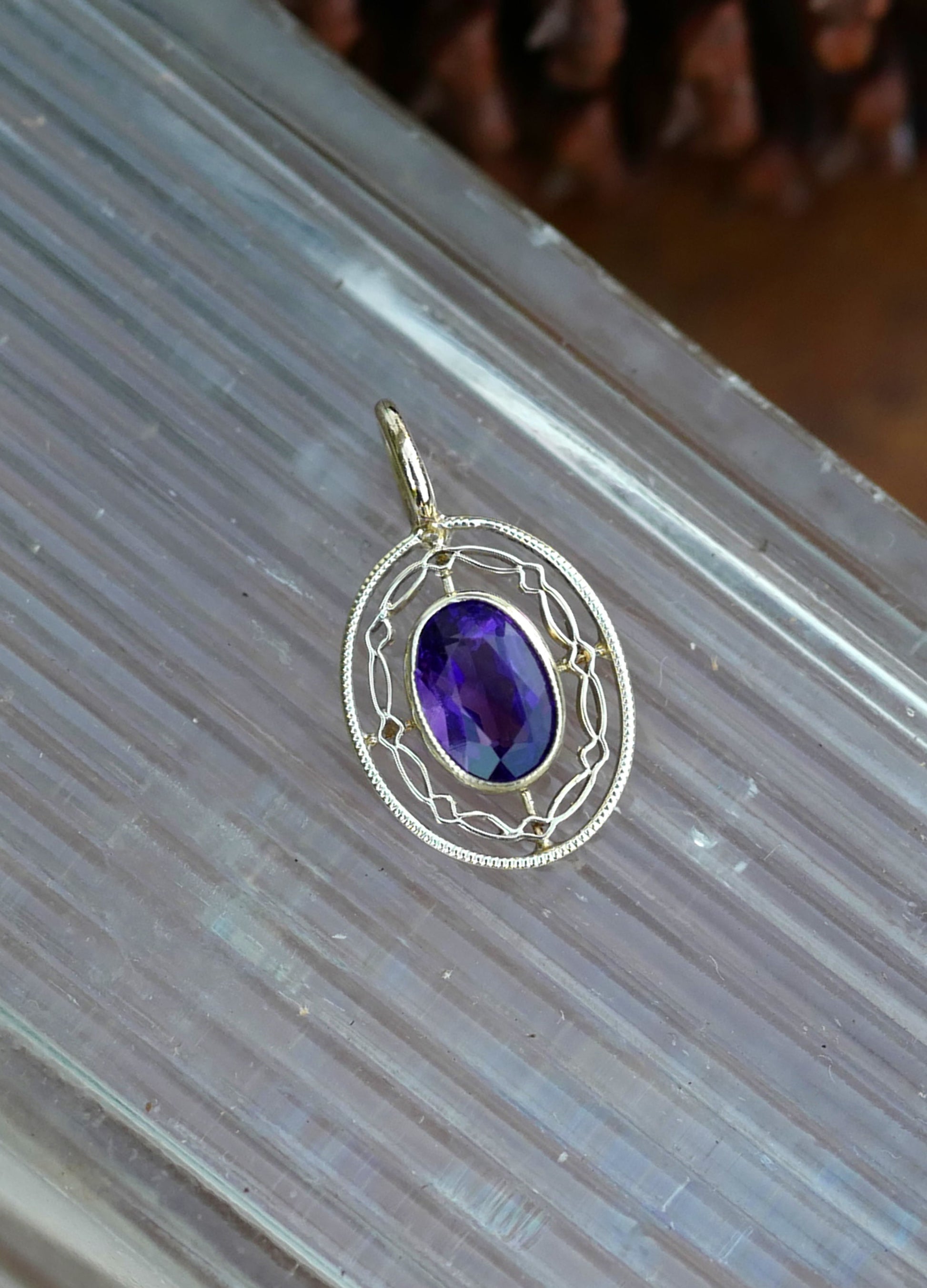 Once a vintage stickpin, this piece was converted to a pendant...A rich natural amethyst (5x7 mm) is at the center of a fine ornate gold filagree design.