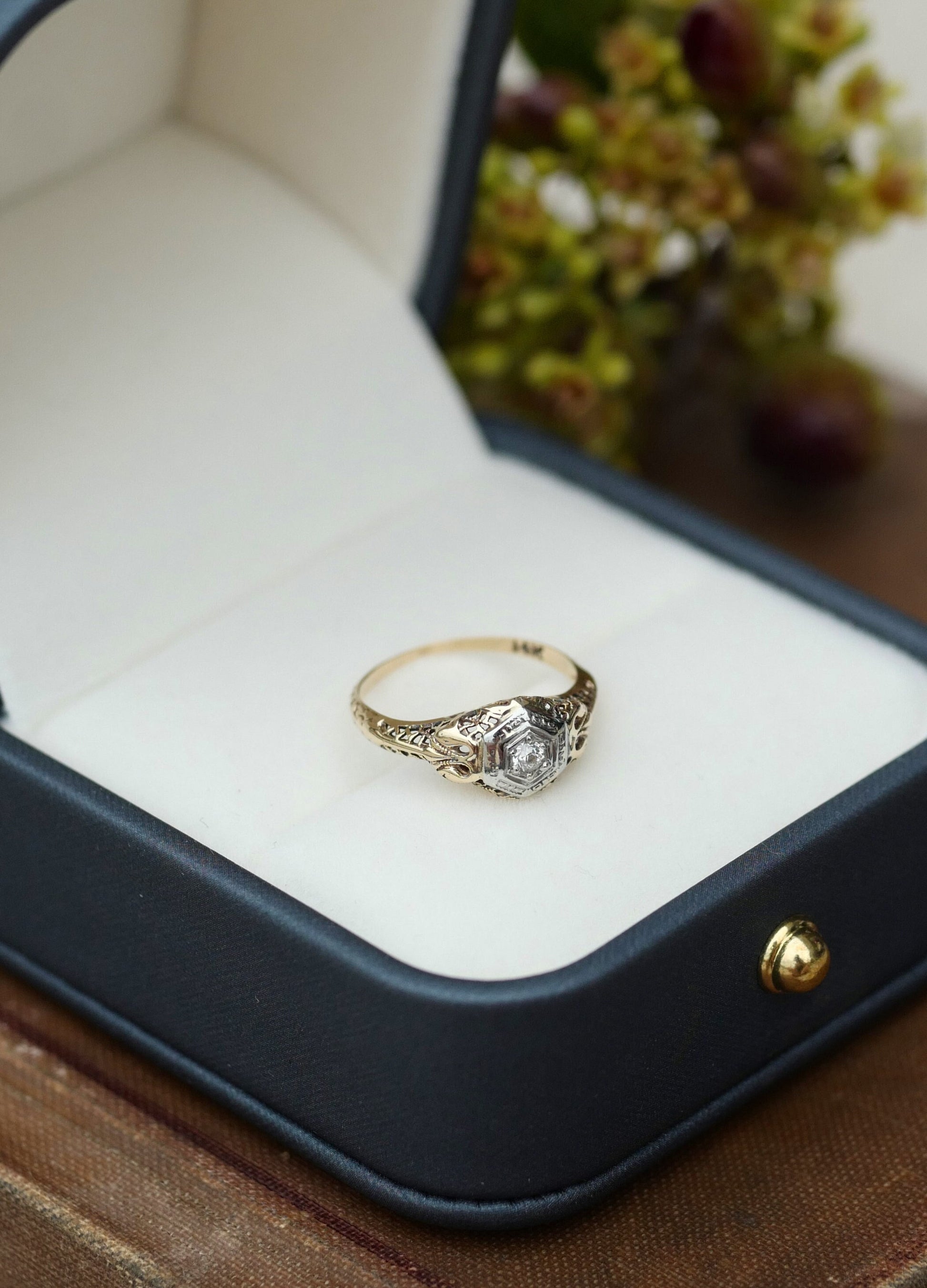 This lovely delicate filagree ring has been brought back to life - An authentic, 2.5 mm Old Mine cut Diamond with beautiful chunky facets is the focal point of this cleaned and restored deco treasure.