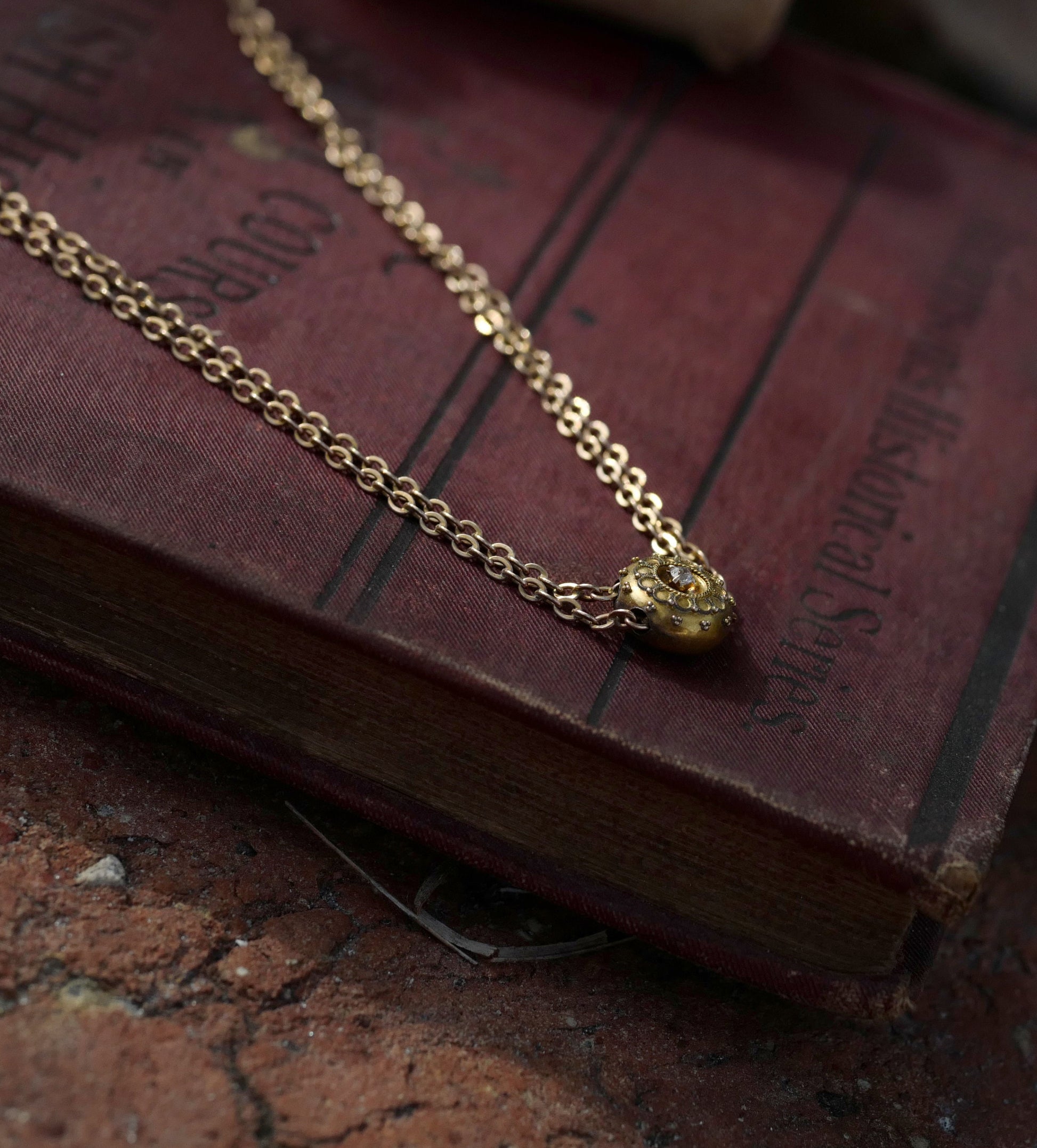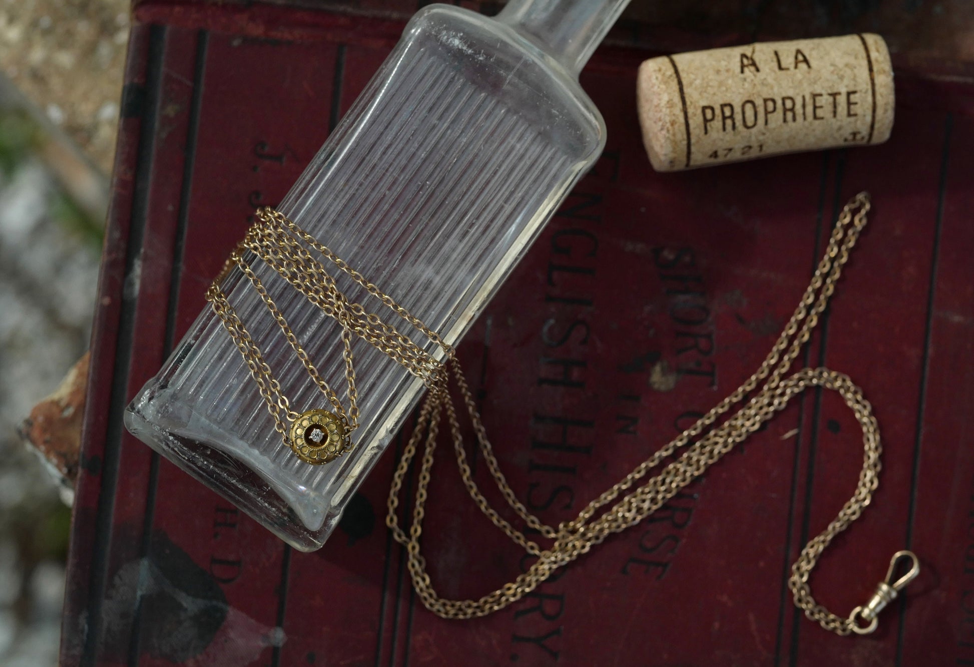 10 Solid Grams of beautiful history. This double slide pendant is on 10K Chain, with a antique clasp. the pendant is round ( 10 mm) with an intricate face and a 2mm old mine cut diamond. 25mm in length, this is a lovely piece.