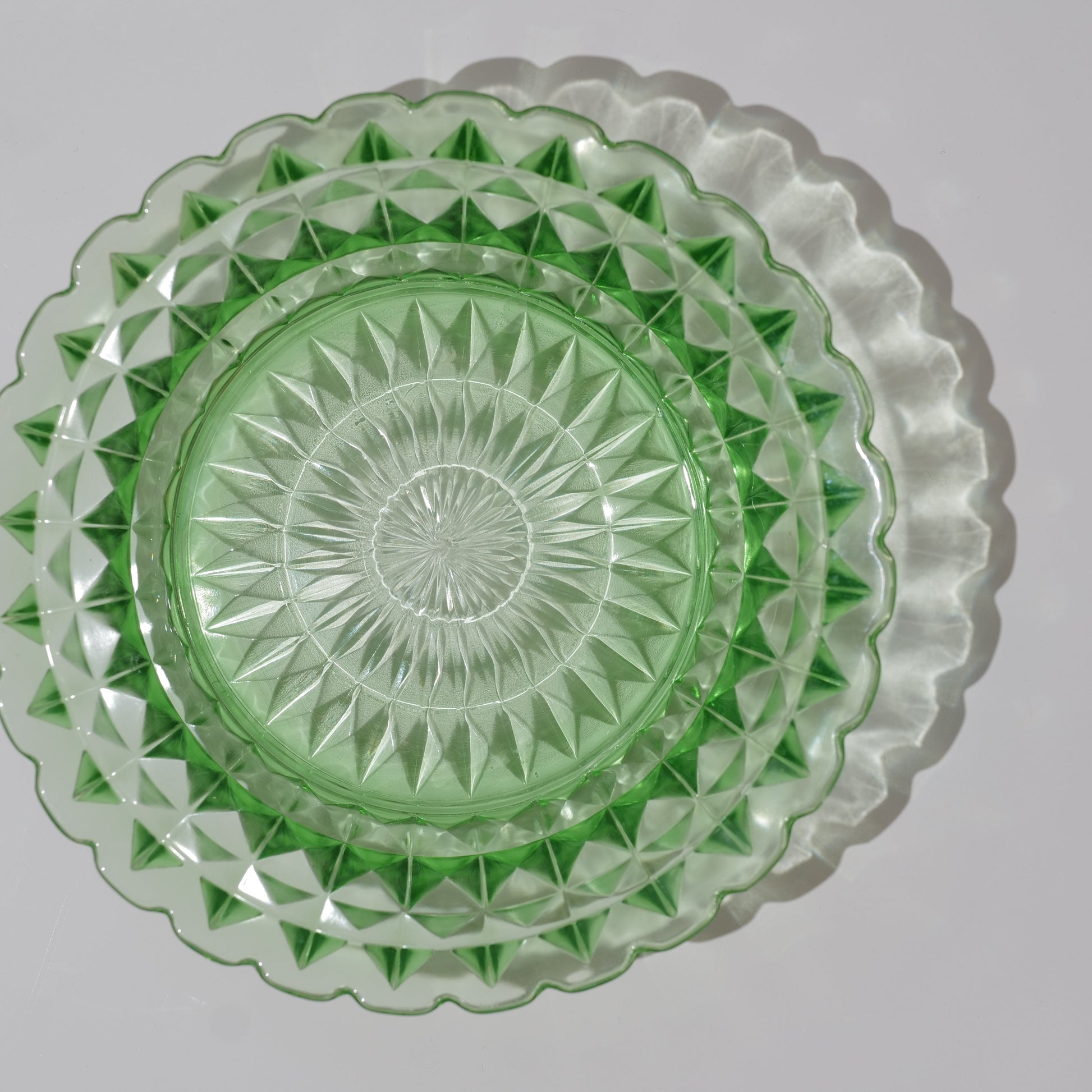 This Antique Berry Bowl or Serving Bowl produced between 1929 and 1940, features a classic diamond scalloped pattern that adds a touch of vintage elegance to your collection. Its green Vaseline glass subtly glows under light, making it both a charming serving piece and a treasured antique.