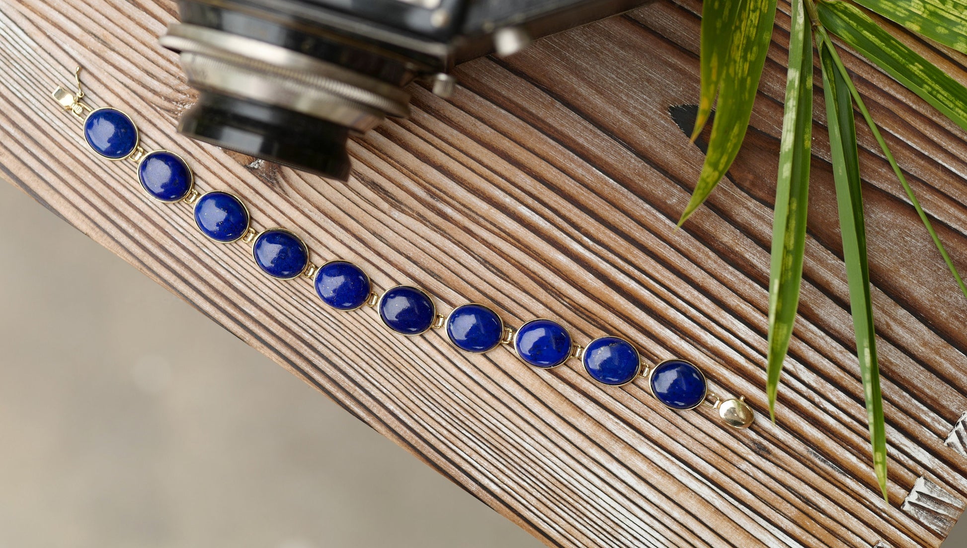 Ten, deep blue lapis stones, are framed in 14K soft yellow gold and linked together to form this beautiful bracelet. Perfect to layer with other chains - but also striking as a statement piece. The blue is so rich and elegant - it's sure to 'wow'! Each polished stone is 10mm x 12mm and some have sprinklings of gold flecks.