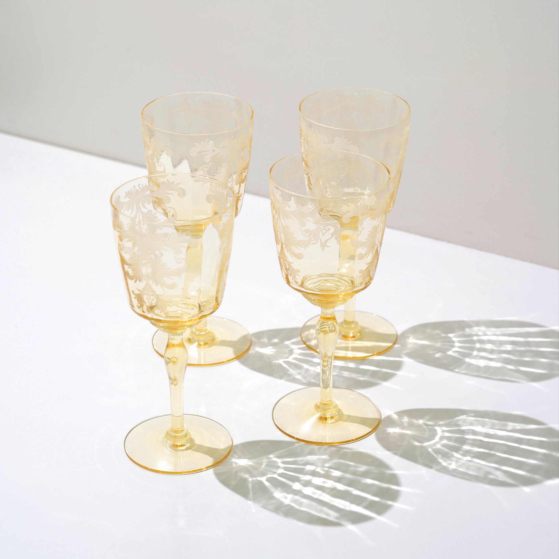 This set of four vintage 1950s Tiffin Cordelia wine glasses features finely etched designs on yellow-tinted blown glass. Renowned for their delicate craftsmanship and elegant detailing, these glasses exemplify mid-century sophistication. Their distinctive yellow hue and intricate etching make them a prized addition for collectors and enthusiasts of classic glassware.