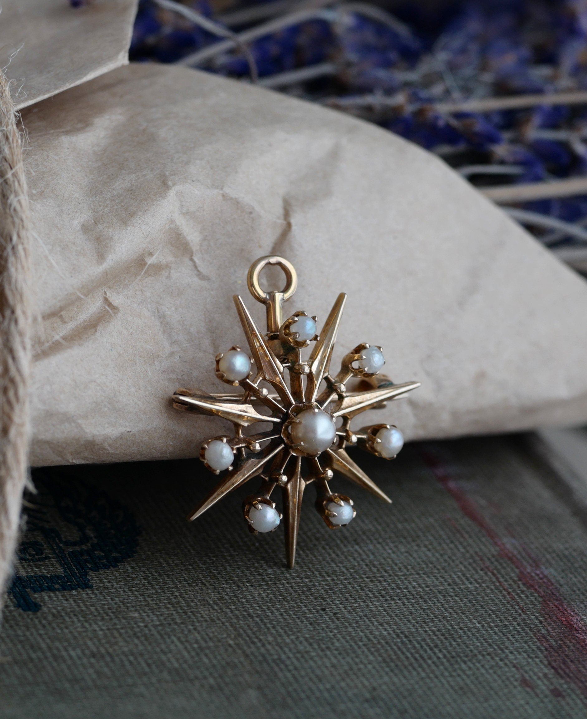 Victorian Era 13K Vintage Starburst and Seed Pearl Pendant or Pin