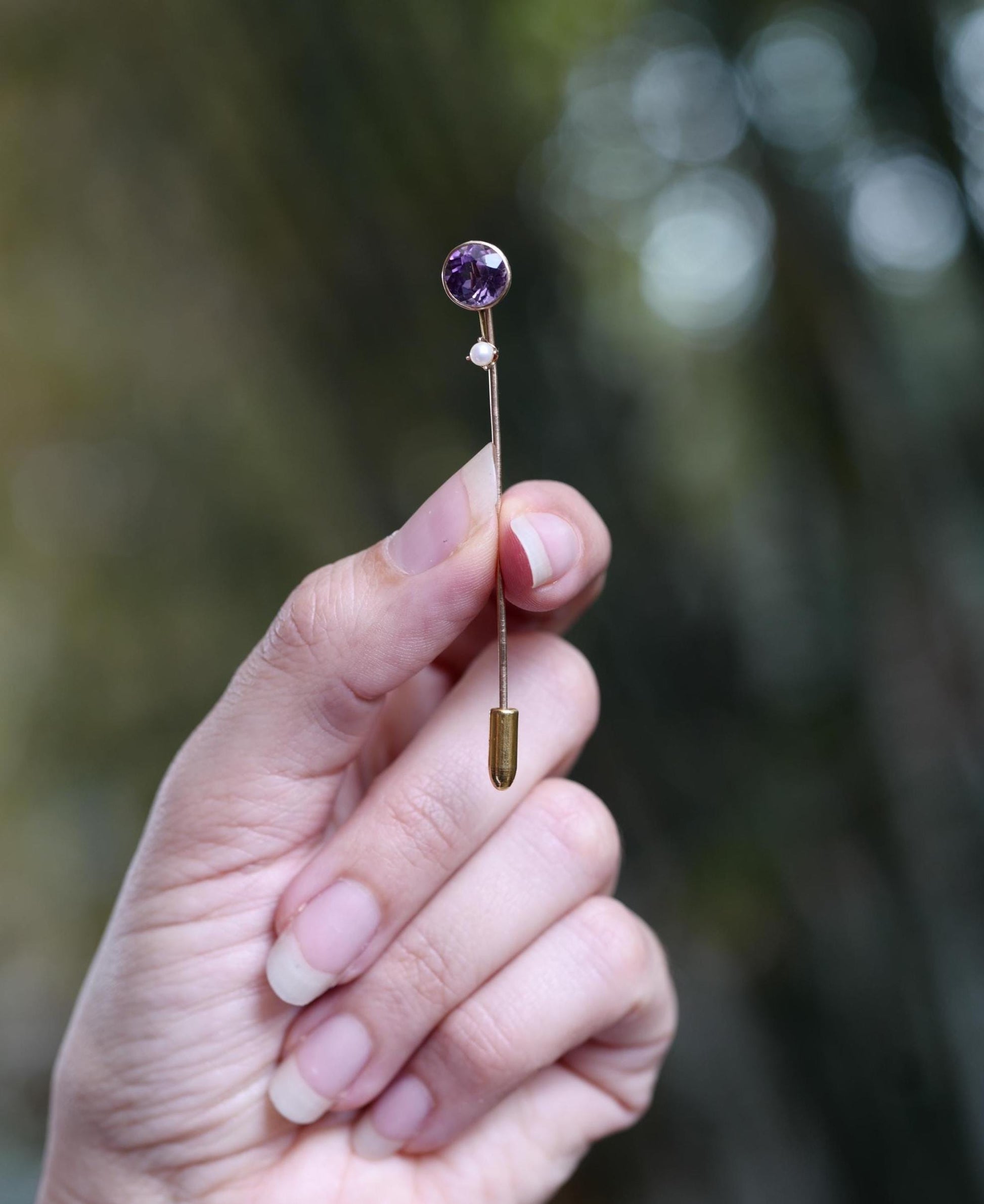 Vintage 10K Amethyst and Seed Pearl Stick Pin